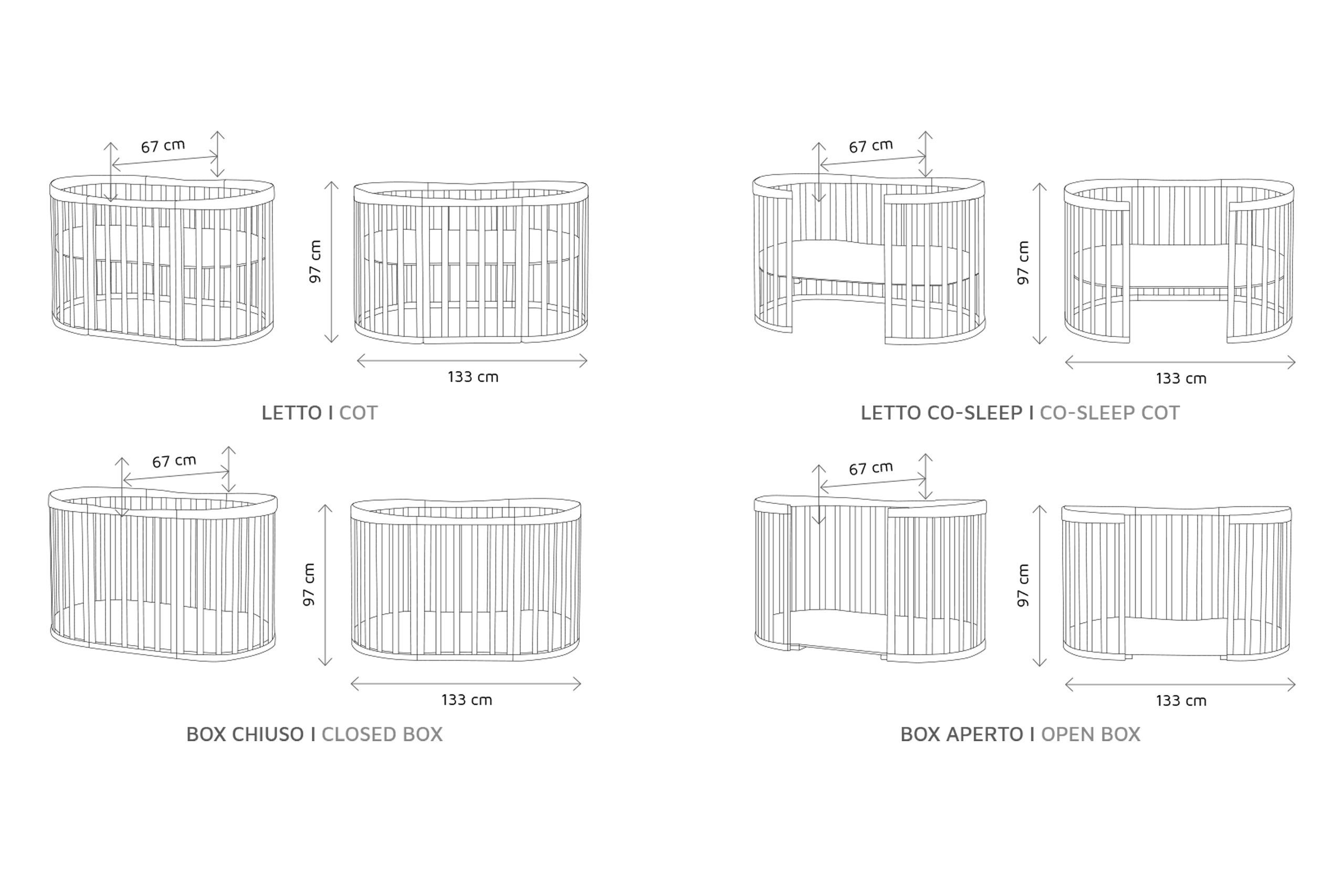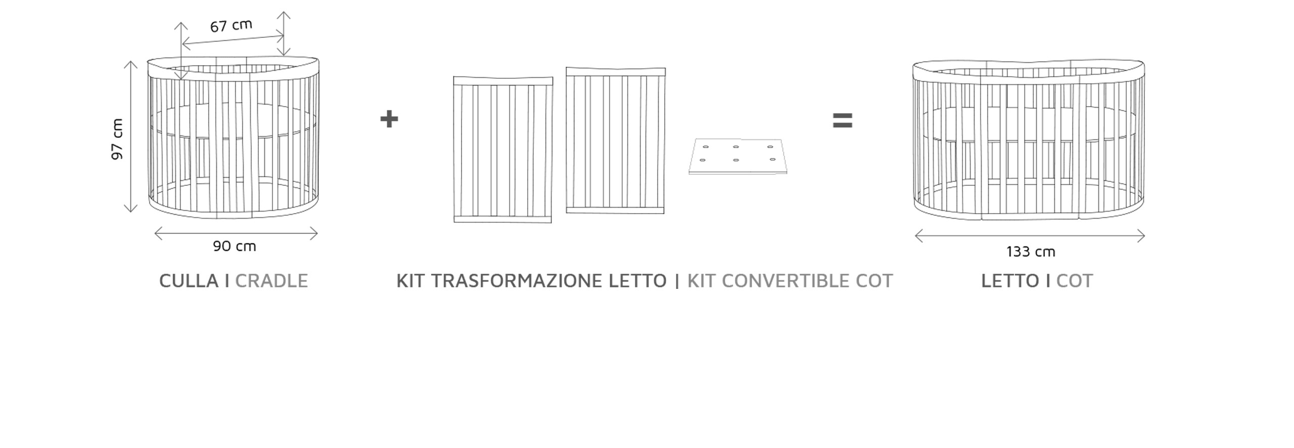 CULLA CON MATERASSO + KIT PER LA TRASFORMAZIONE LETTINO + TESSILE PER CULLA E TESSILE PER LETTINO + MATERASSO PER LETTINO