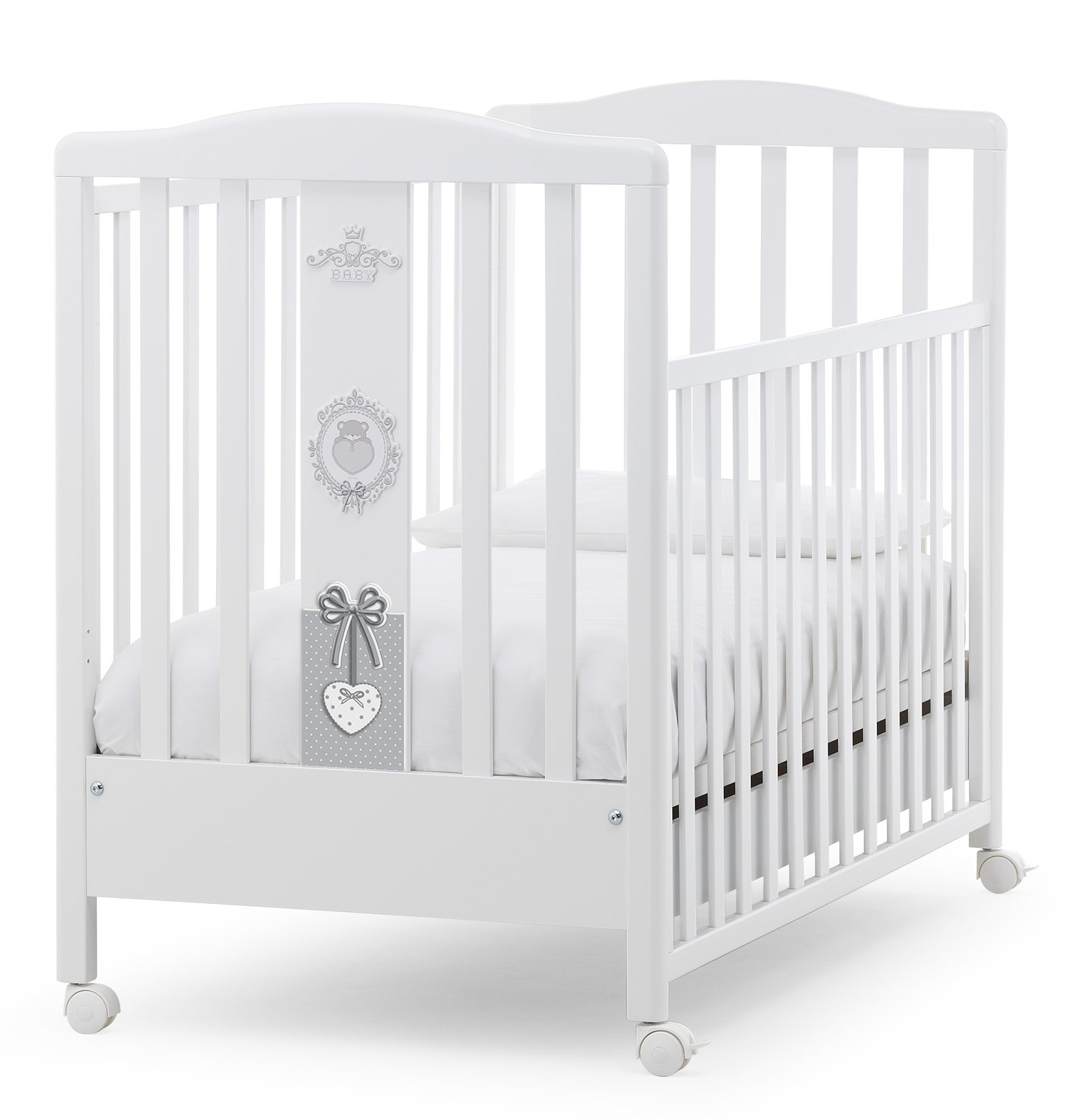 Lettino disponibile nella variante colore Bianco, la stecca centrale della pediera viene adornata con eleganti decori in rilievo in tinta Grigia.