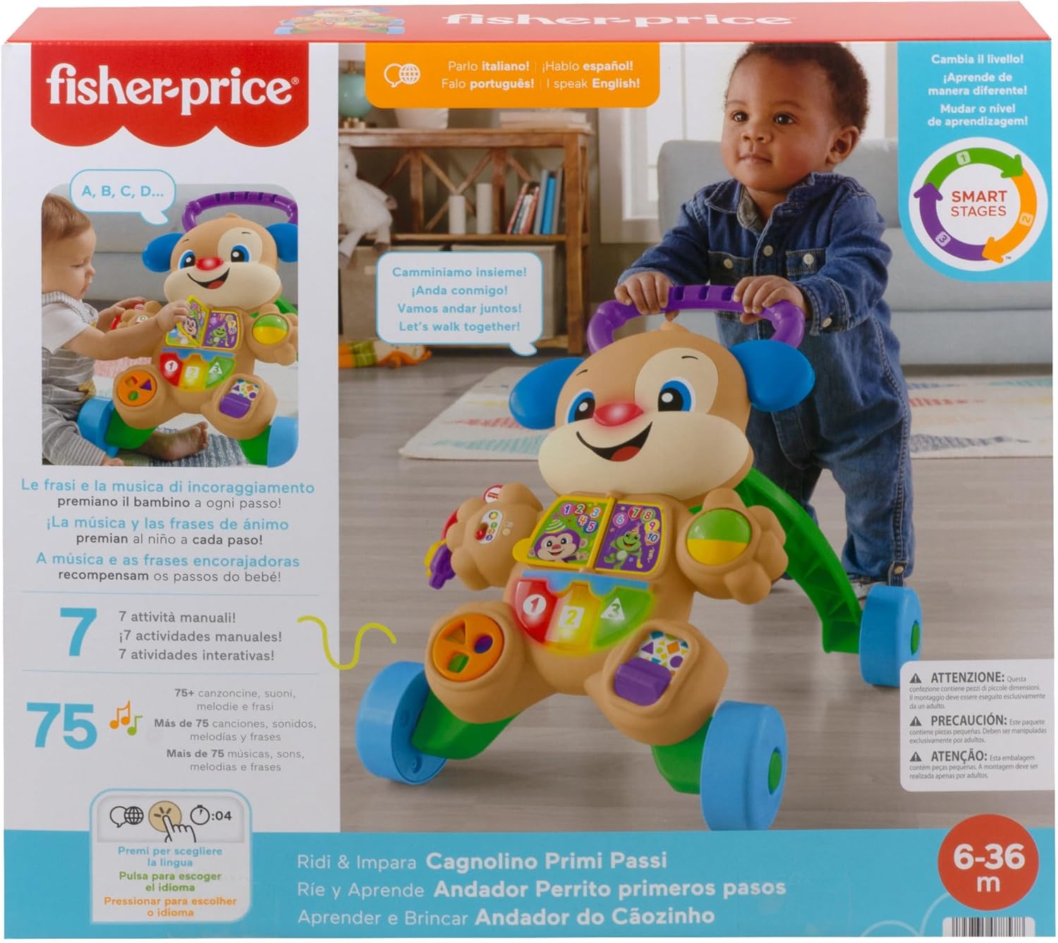 I 3 livelli Smart Stages con oltre 75 canzoncine, suoni e frasi insegnano l'alfabeto, le forme, i colori, i numeri e parole in inglese (la modalità inglese insegna parole in francese)