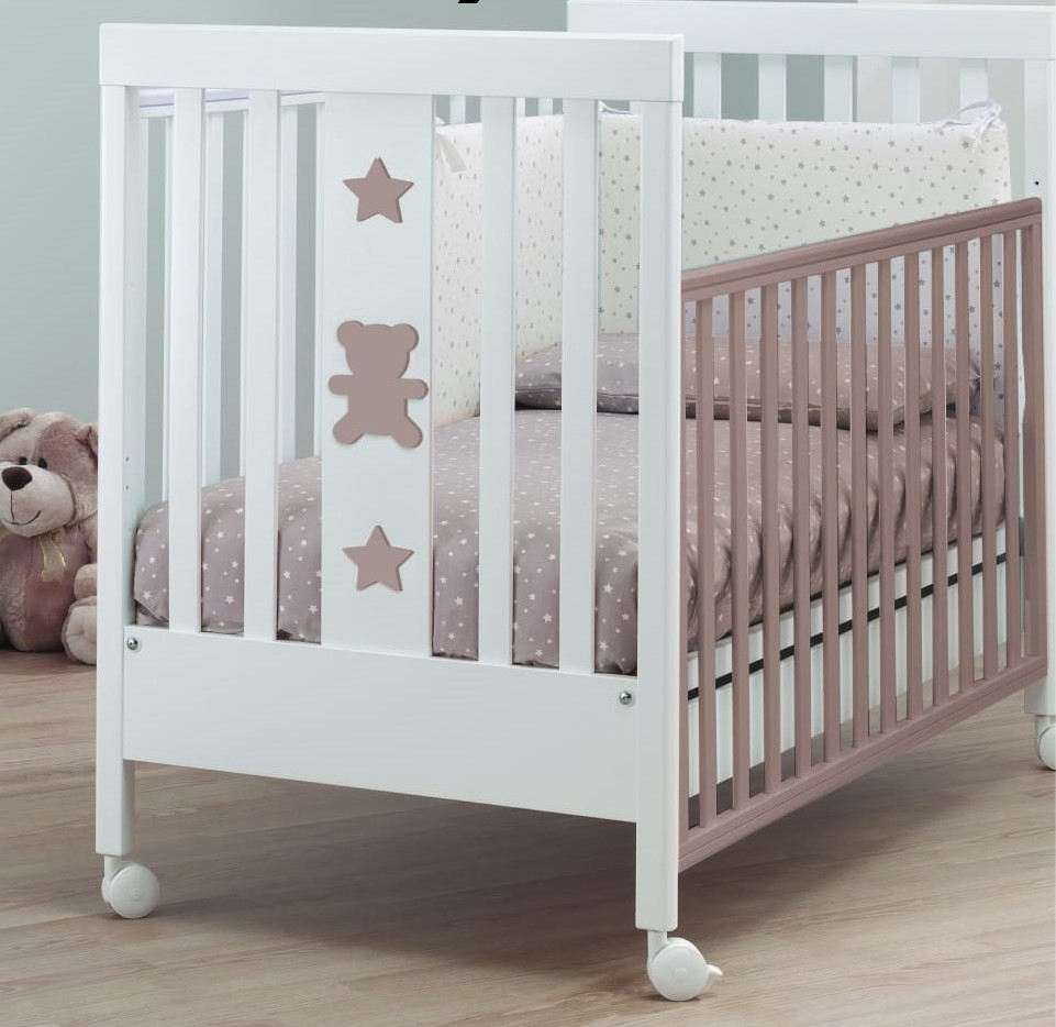 Lettino disponibile nella variante colore Bianco con spondine tortora, la stecca centrale della pediera viene adornata con eleganti decori in rilievo in tinta tortora