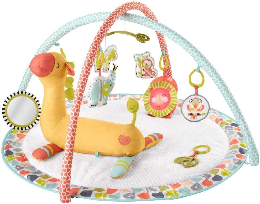 Il cuscino della giraffa sostiene il bambino mentre gioca disteso sul pancino e sarà un amico da portare con sé una volta cresciuto