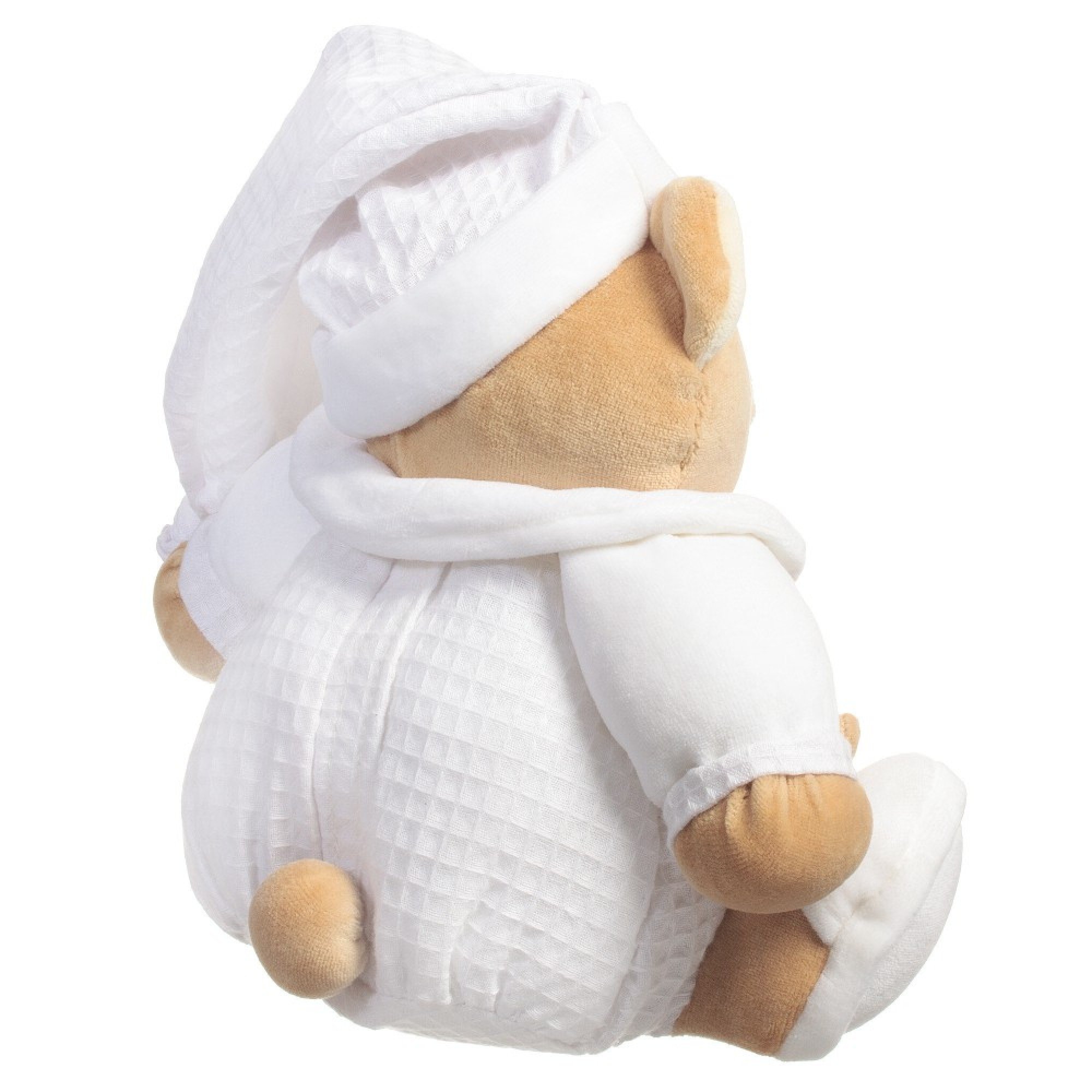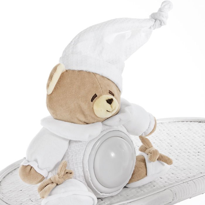 Tato che si illumina è un dolcissimo peluche a forma di orsetto, completamente rivestito in puro cotone al 100%. Sulla pancia si trova un interruttore rotondo, una volta toccato, emana una luce tenue. Indispensabile per il bambino prima e durante il momento della nanna, per farlo sentire protetto e al sicuro in compagnia del suo piccolo amico. La luce non riscalda il peluche, così il bebè può dormire abbracciato al suo orsetto illuminato. Tato è un tenero compagno del tuo bambino e lo accompagna in ogni momento del giorno e della notte! Dimensioni: 25cm