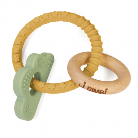 composto da 3 elementi in legno e silicone di forme e consistenze diverse, con texture e rilievi che soddisfano l’istinto di mordere.